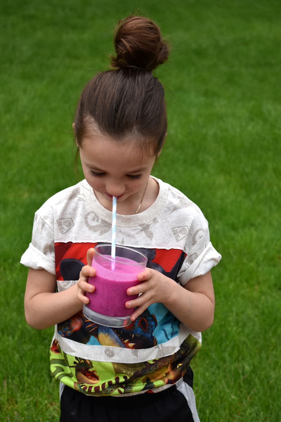 You can feel free to use whatever other fruits that you want in this dragon fruit smoothie but I decided to go with frozen banana, frozen raspberries, protein powder to make it filling, milk and of course the dragon fruit. This smoothie is protein rich from the protein powder and milk and full of antioxidants, vitamins, minerals and fiber from the fruit! A perfect snack or breakfast.When kids see this bright colored beautiful smoothie, they will be sure to want to drink it. I know that my kids were super pumped to drink it. I find that having them help make it encourages them to drink it so much more. Recently, Adalyn requested a smoothie for breakfast and I asked her to put the baby spinach in while I went and did something else. Well, she packed that smoothie with at least 2 packed cups of spinach and ended up loving it because she made it! Mom win!